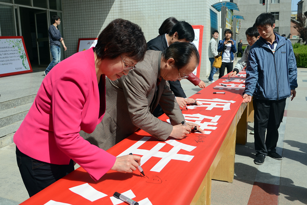 曾佳伟代表全校学生做了表态发言。出席仪式的领导和学生代表们在“节能减排,低碳生活”宣传横幅上签名。