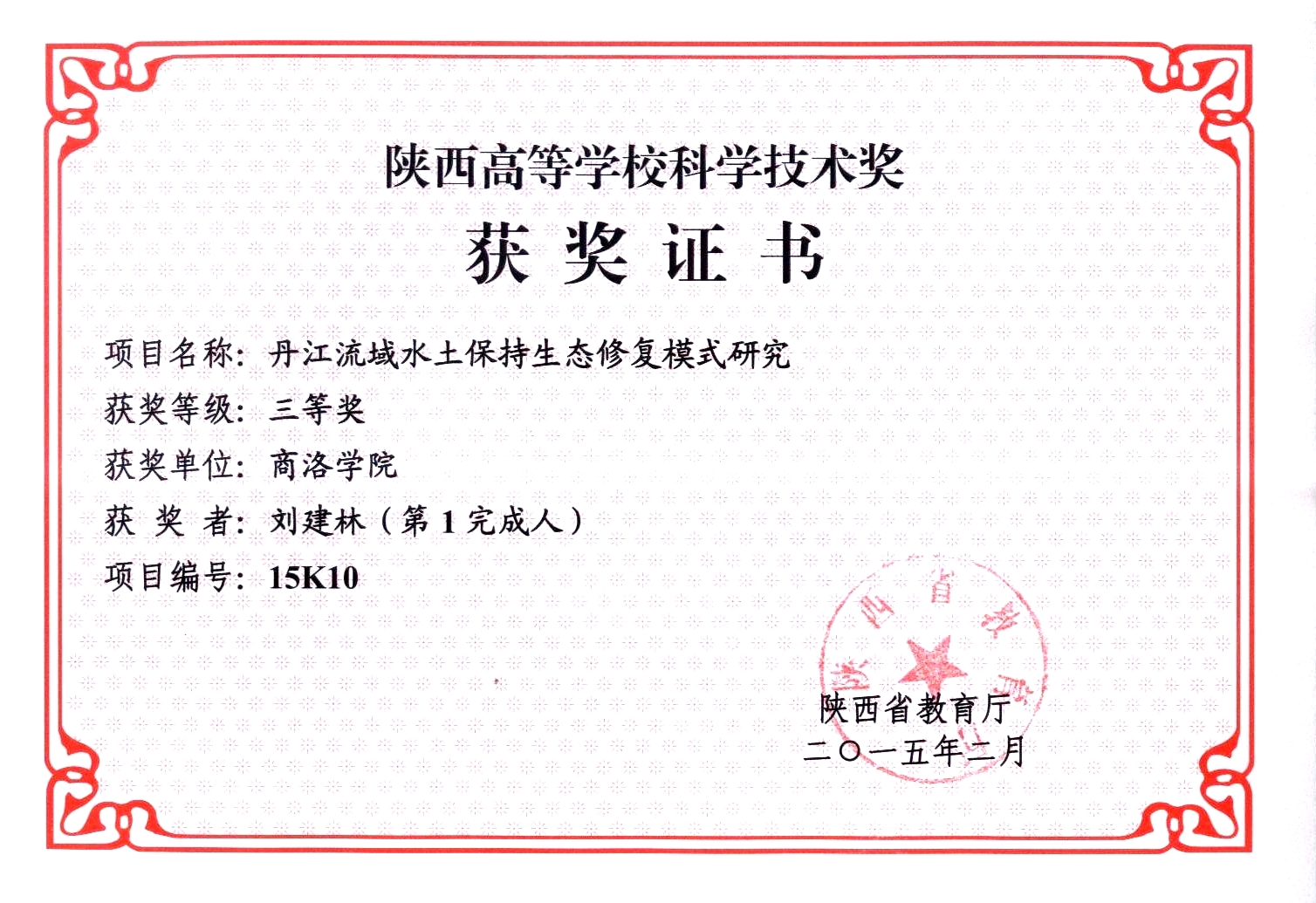 根据陕西省教育厅《关于公布2015年度陕西高等学校科学技术奖的通知》(陕教技〔2015〕3号),由我校刘建林教授主持申报的《丹江流域水土保持生态修复模式研究》,荣获2015年度陕西高等学校科学技术奖三等奖。